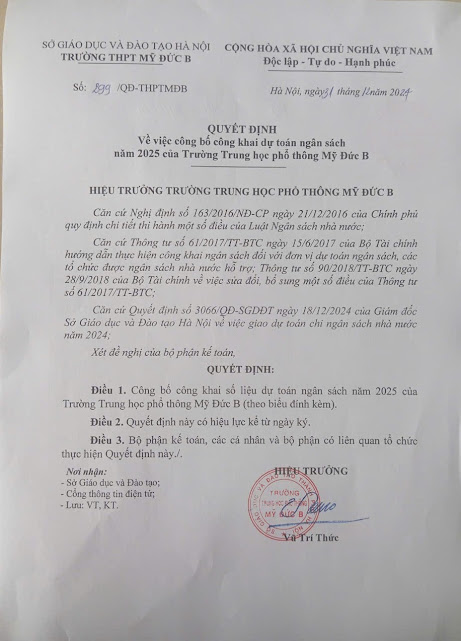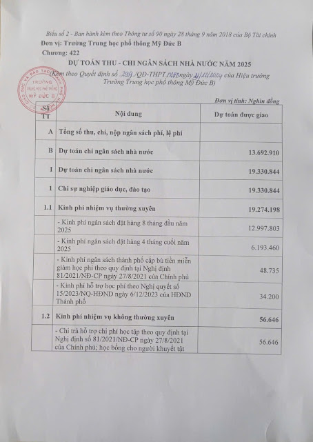 CÔNG KHAI DỰ TOÁN NGÂN SÁCH NĂM 2025 CỦA TRƯỜNG THPT MỸ ĐỨC B