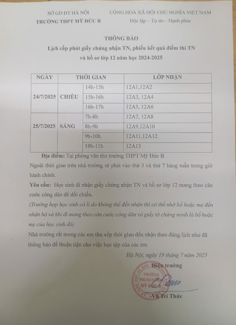 LỊCH CẤP PHÁT GIẤY CHỨNG NHẬN TN, PHIẾU KẾT QUẢ ĐIỂM THI TN VÀ HỒ SƠ LỚP 12 NĂM HỌC 2024-2025
